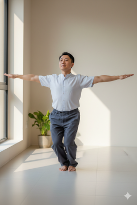 Phiên thân: Chân phải trước, chân trái sau (chân trái như chống chân xe máy), 2 tay xuôi phía trước. Khi hít vào, 2 tay mở rộng ra 2 bên, đồng thời cột sống vận động từ trước ra sau. Thực hiện 9 lần.